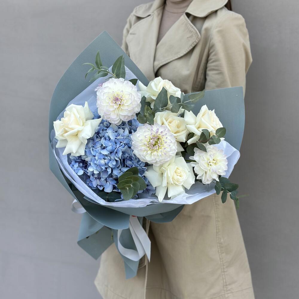 розы - 5 шт. георгины - 3 шт. Гортензия - 1 шт. Эвкалипт - 2 шт.